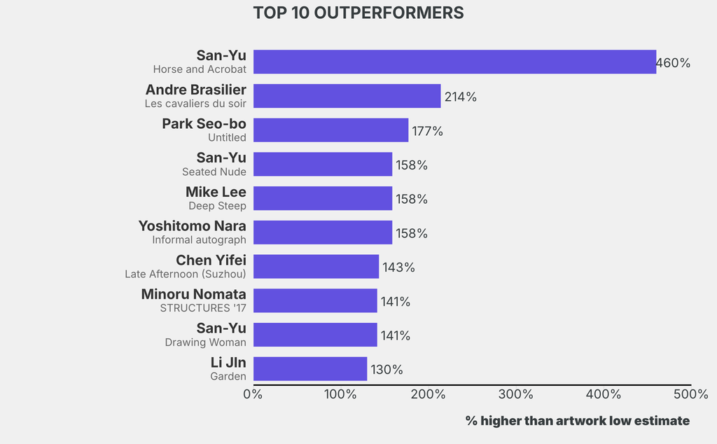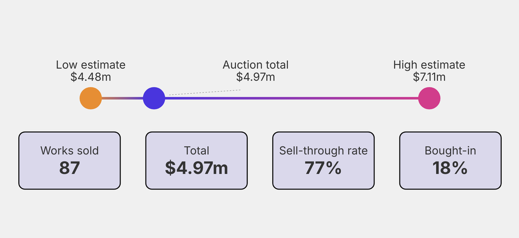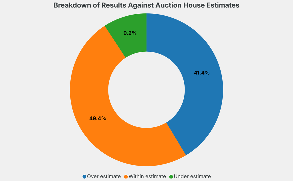 All results include the fees and premiums added to the price of a work of art when the auctioneer's hammer falls. Estimates, sale prices and totals are converted into US dollars. Sale prices are compared to the auction house’s low estimate, which do not include premiums.