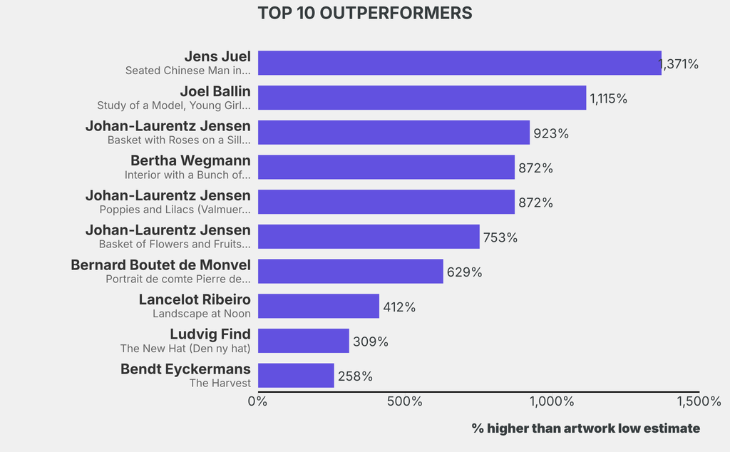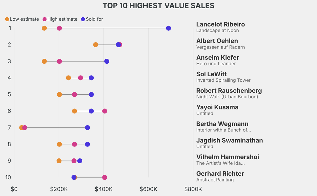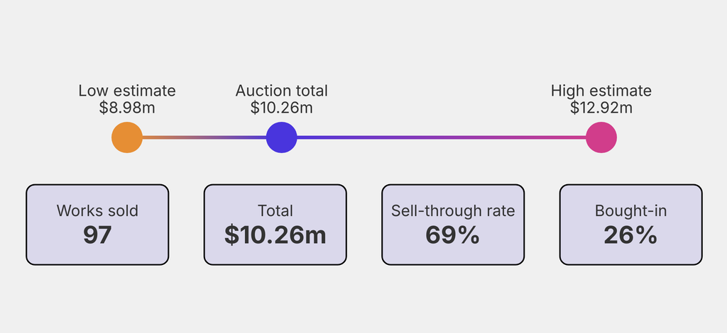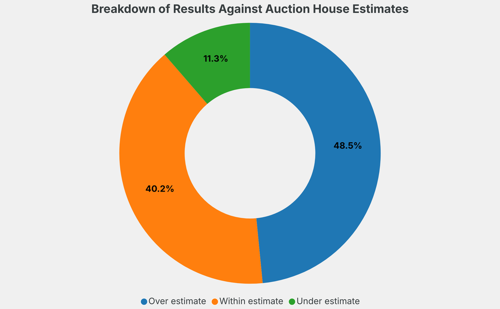 All results include the fees and premiums added to the price of a work of art when the auctioneer's hammer falls. Estimates, sale prices and totals are converted into US dollars. Sale prices are compared to the auction house’s low estimate, which do not include premiums.