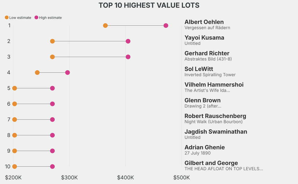 The highest-value lot announced is: Albert Oehlen, Vergessen auf Rädern (2005), which is estimated to sell for between $364,100 and $472,000. It has been traded twice in the past.