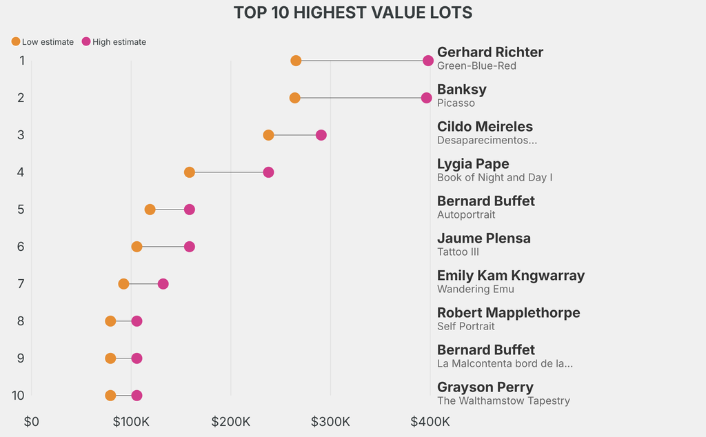 The highest-value lot announced is: Gerhard Richter, Green-Blue-Red (1993), which is estimated to sell for between $265,300 and $398,000. It has been traded 5 times in the past.