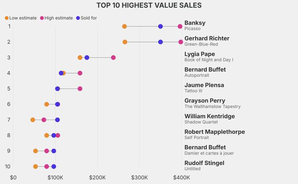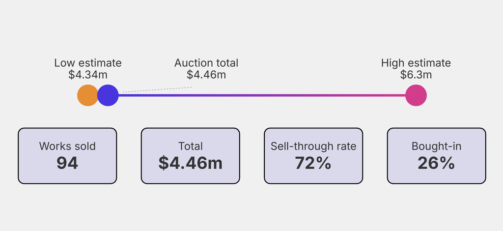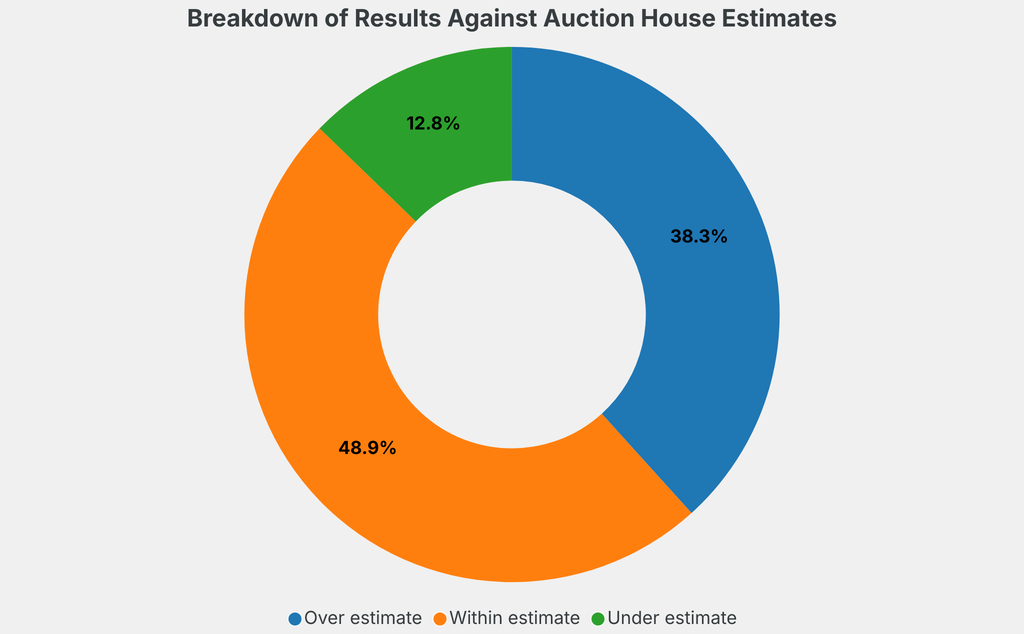 All results include the fees and premiums added to the price of a work of art when the auctioneer's hammer falls. Estimates, sale prices and totals are converted into US dollars. Sale prices are compared to the auction house’s low estimate, which do not include premiums.