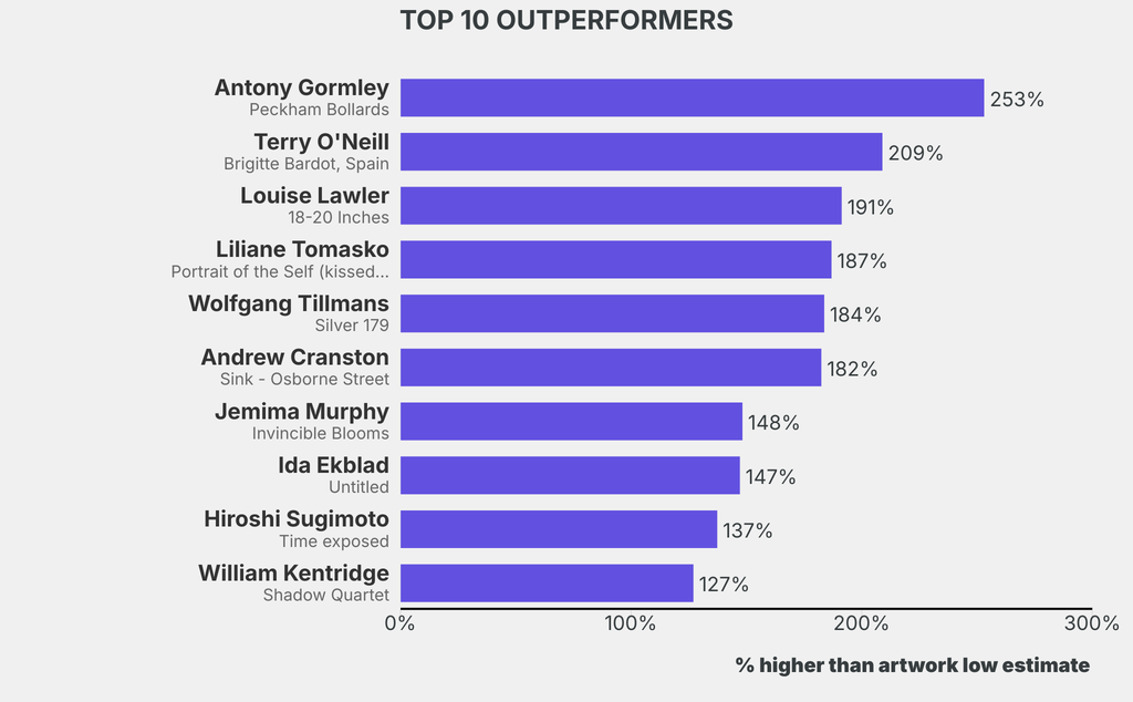The outperformer sold for 253% above its low estimate. Antony Gormley, Peckham Bollards (2001), sold for $70,000 ($19,800 low estimate). It has been traded twice in the past.