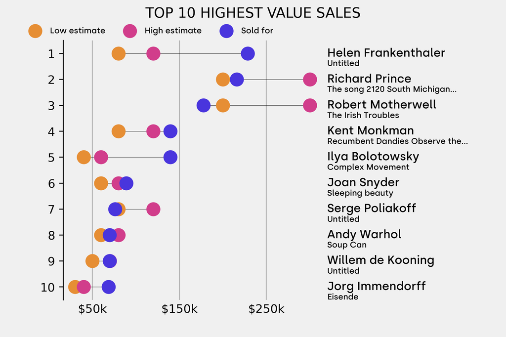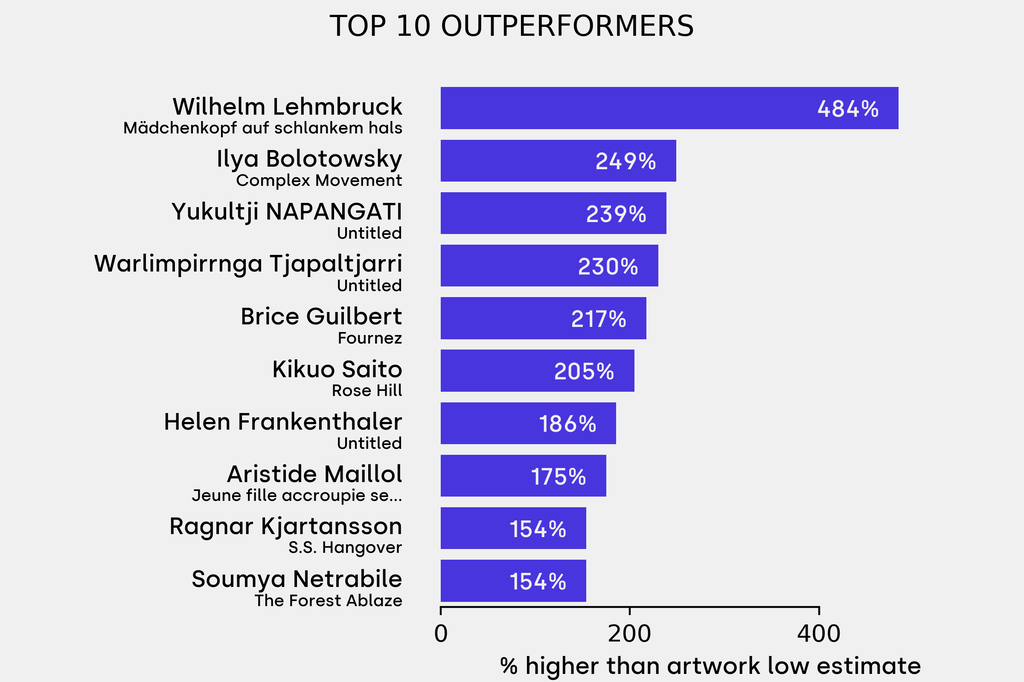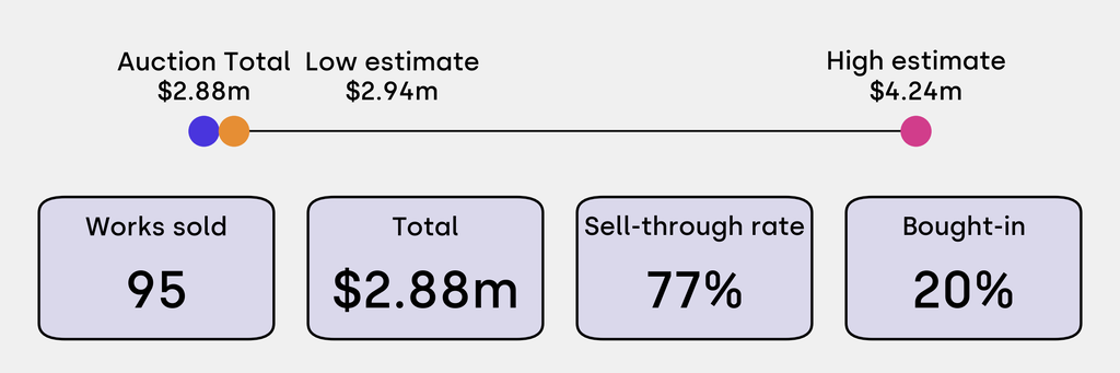 All results include the fees and premiums added to the price of a work of art when the auctioneer's hammer falls. Sale prices are compared to the auction house’s low estimate, which do not include premiums.