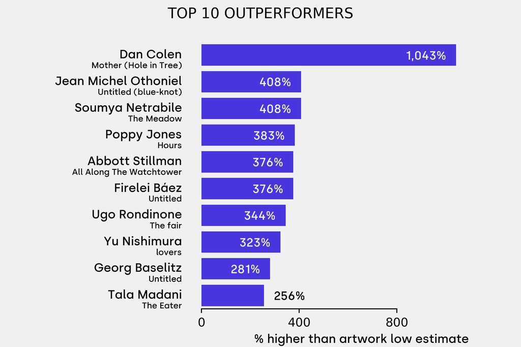 All results include the fees and premiums added to the price of a work of art when the auctioneer's hammer falls. Sale prices are compared to the auction house’s low estimate, which do not include premiums.