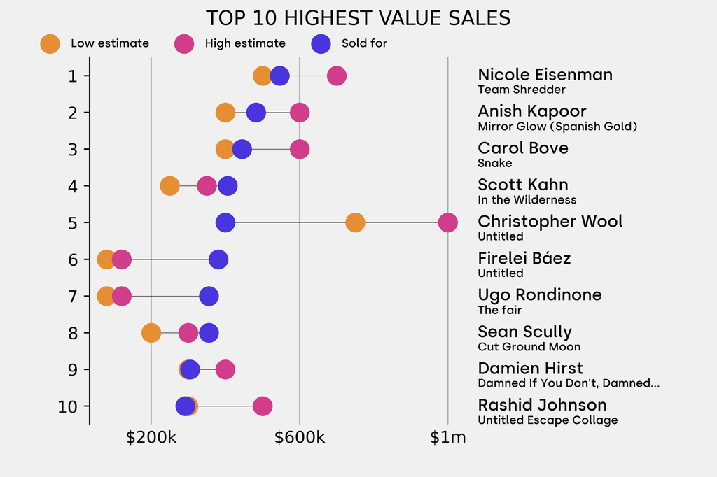23 works were bought-in, including: Kaws, COMPANION (RESTING PLACE) (2013), estimated at $500,000 (low) to $700,000 (high). It has been traded twice in the past.