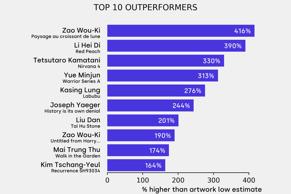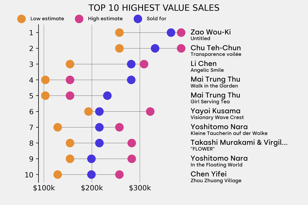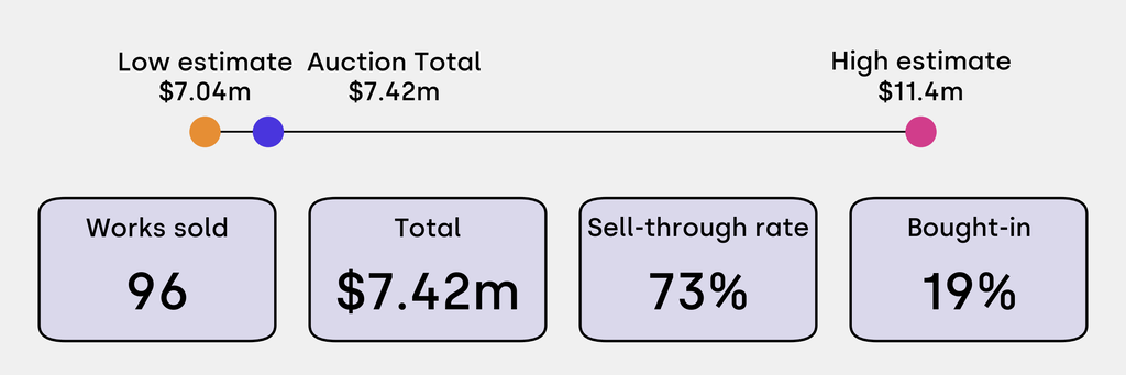 All results include the fees and premiums added to the price of a work of art when the auctioneer's hammer falls. Estimates, sale prices and totals are converted into US dollars. Sale prices are compared to the auction house’s low estimate, which do not include premiums.