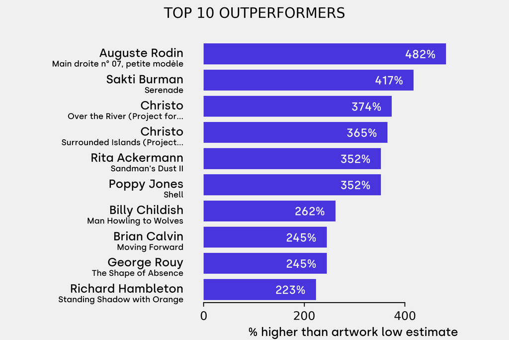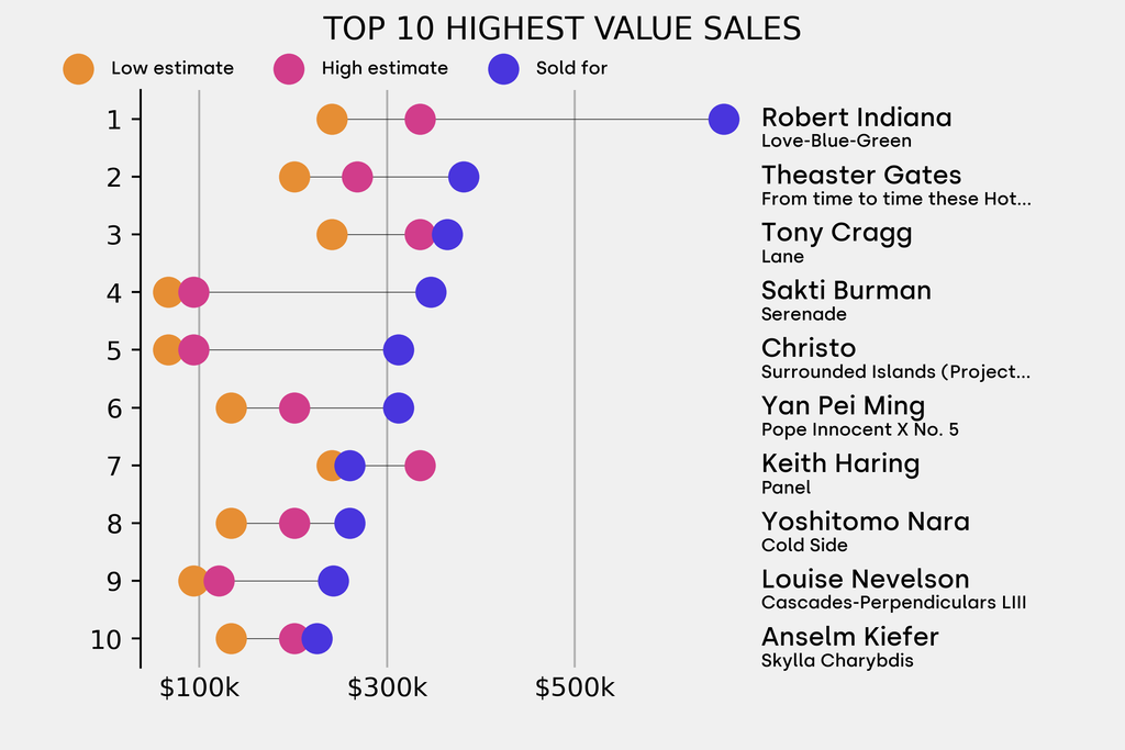 All results include the fees and premiums added to the price of a work of art when the auctioneer's hammer falls. Estimates, sale prices and totals are converted into US dollars. Sale prices are compared to the auction house’s low estimate, which do not include premiums.
