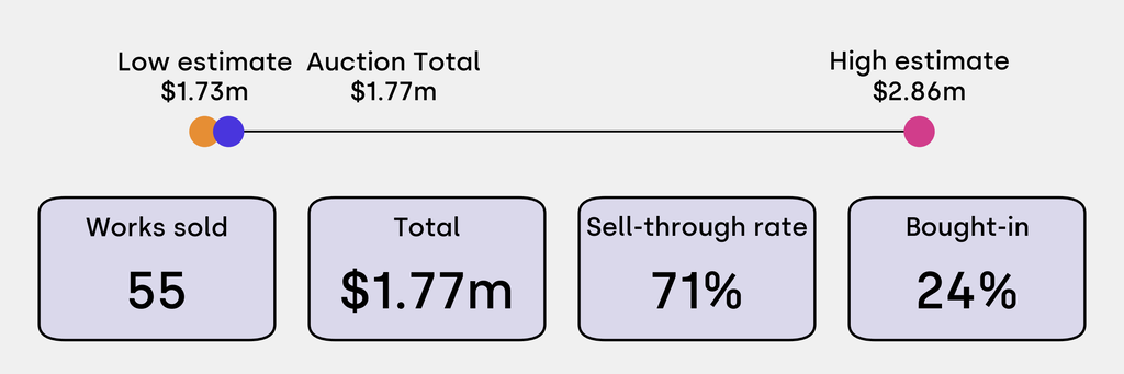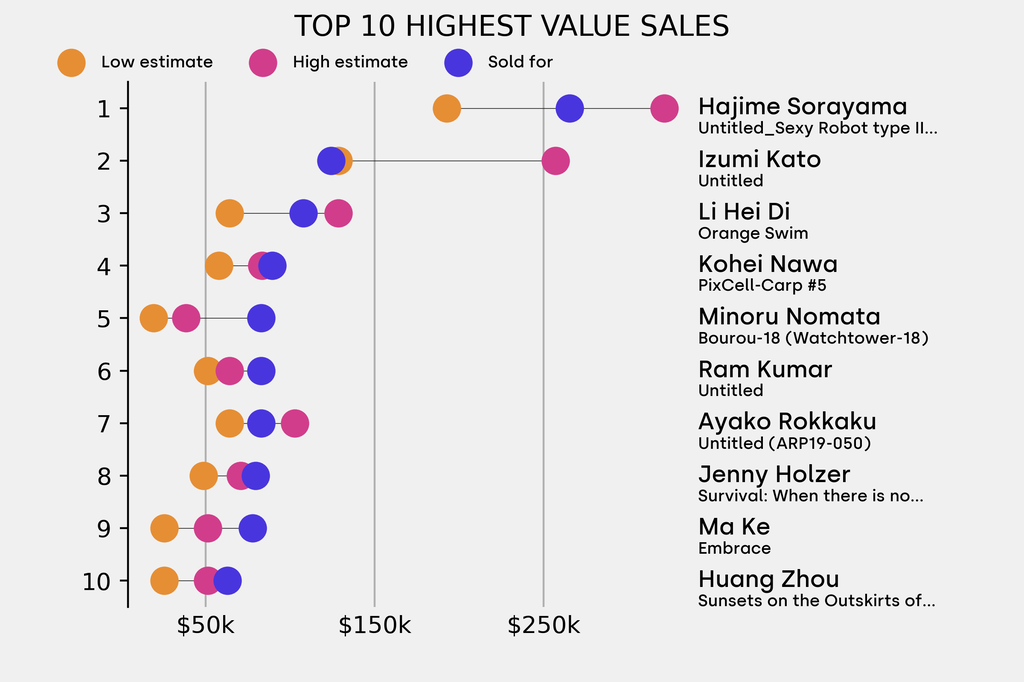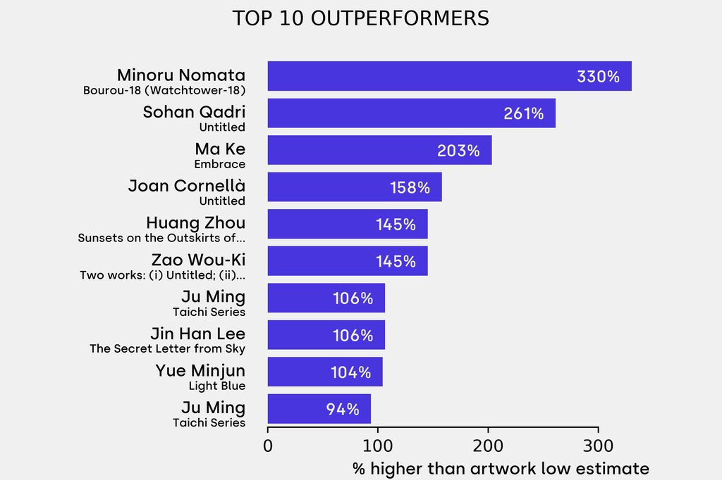 All results include the fees and premiums added to the price of a work of art when the auctioneer's hammer falls. Estimates, sale prices and totals are converted into US dollars. Sale prices are compared to the auction house’s low estimate, which do not include premiums.
