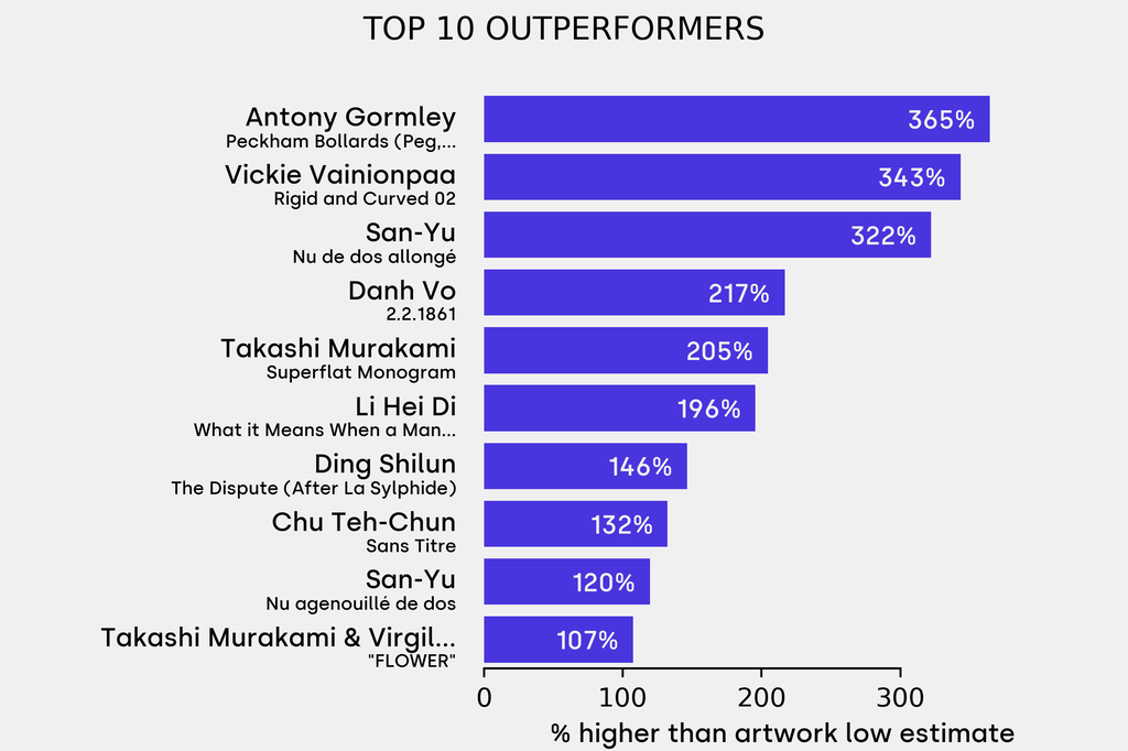 The outperformer sold for 364% above its low estimate. Antony Gormley, Peckham Bollards (Peg, Snowman, Penis and Oval) (2021), sold for $89,100 ($19,200 low estimate). It has been traded once in the past.