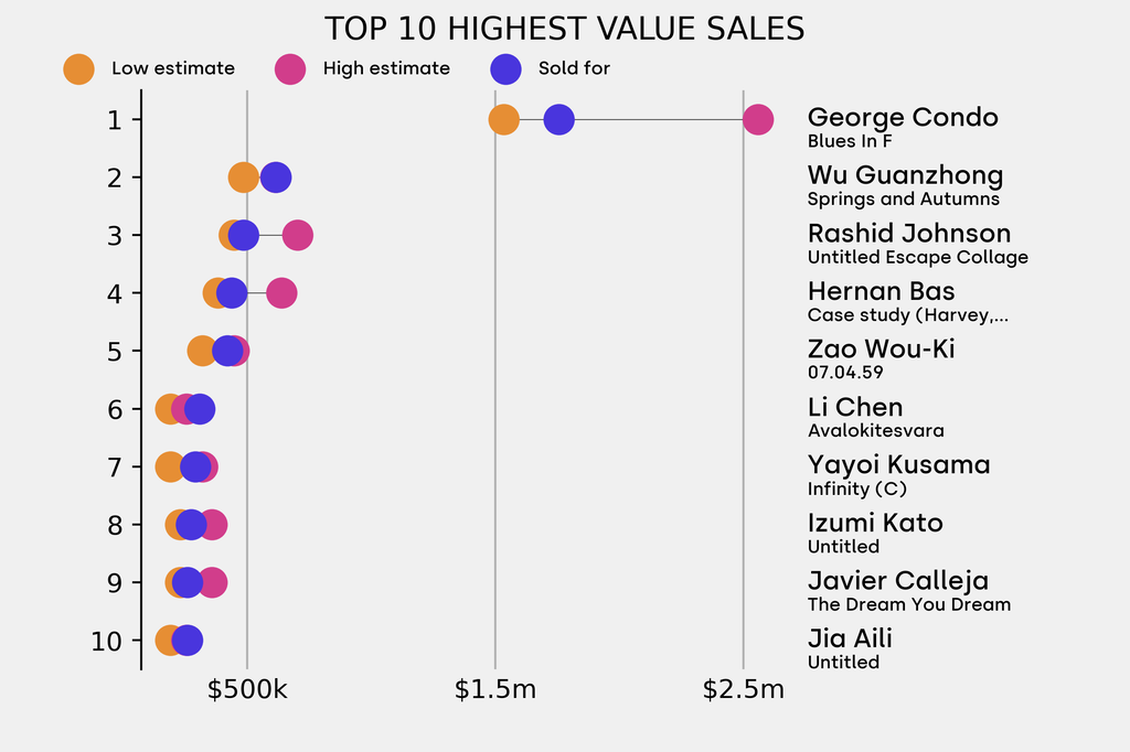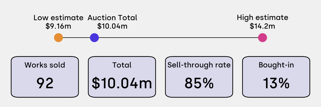 All results include the fees and premiums added to the price of a work of art when the auctioneer's hammer falls. Estimates, sale prices and totals are converted into US dollars. Sale prices are compared to the auction house’s low estimate, which do not include premiums.