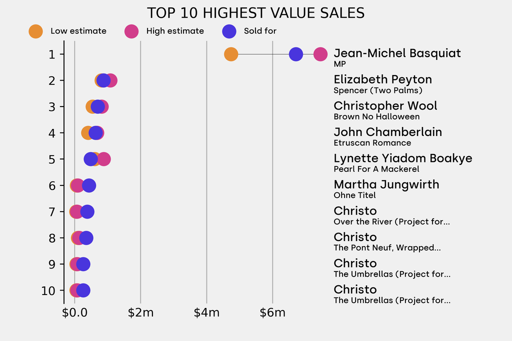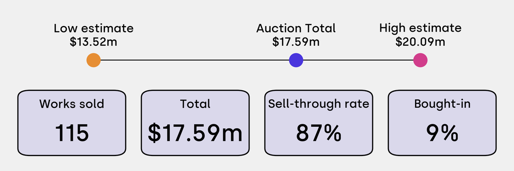All results include the fees and premiums added to the price of a work of art when the auctioneer's hammer falls. Estimates, sale prices and totals are converted into US dollars. Sale prices are compared to the auction house’s low estimate, which do not include premiums.