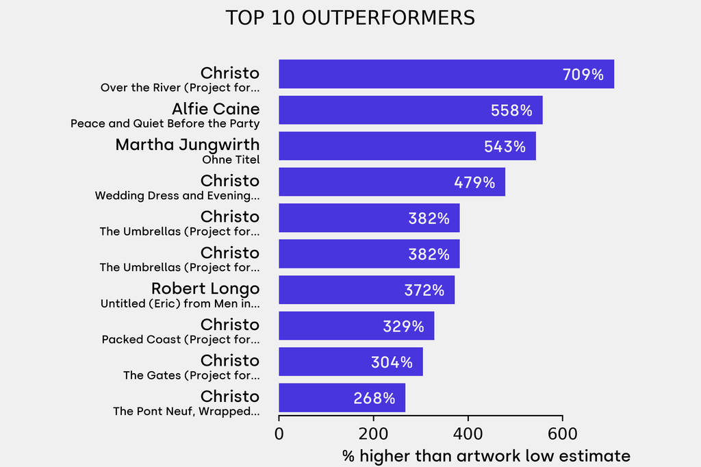 The outperformer sold for 708% above its low estimate. Christo, Over the River (Project for Arkansas River, State of Colorado) (2005), sold for $383,200 ($47,400 low estimate). It has been traded once in the past.
