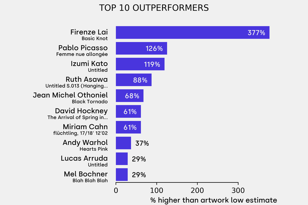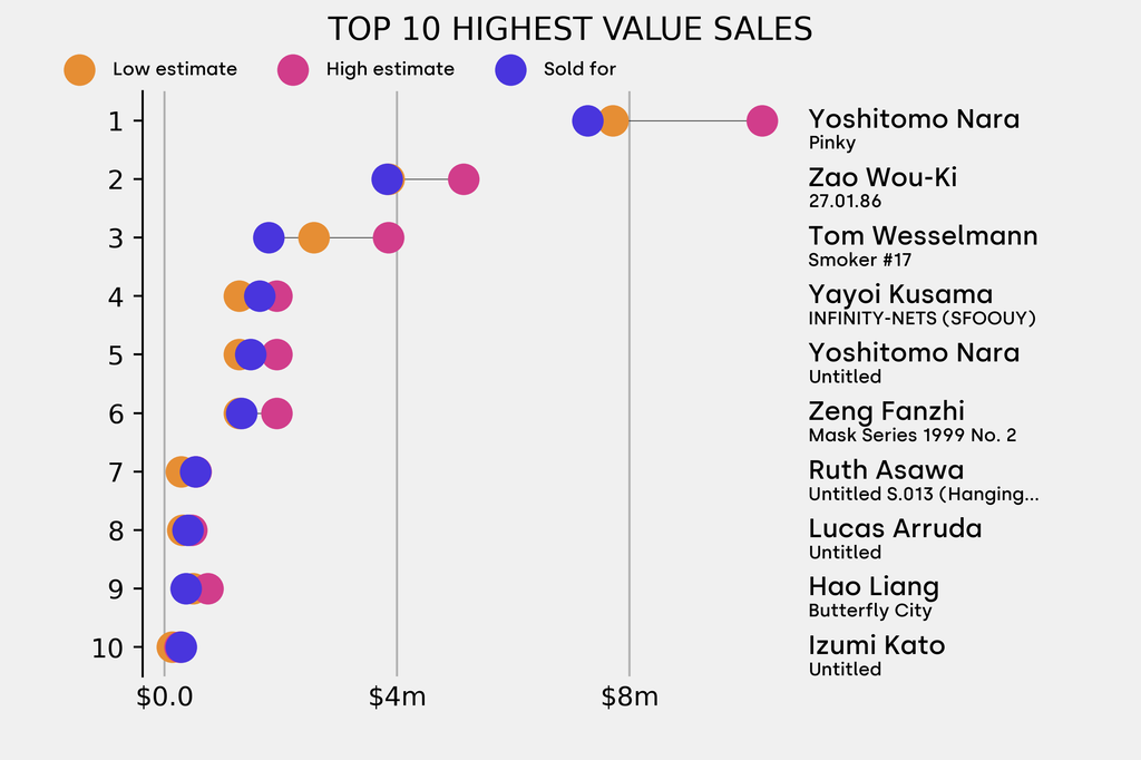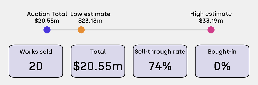 All results include the fees and premiums added to the price of a work of art when the auctioneer's hammer falls. Estimates, sale prices and totals are converted into US dollars. Sale prices are compared to the auction house’s low estimate, which do not include premiums.