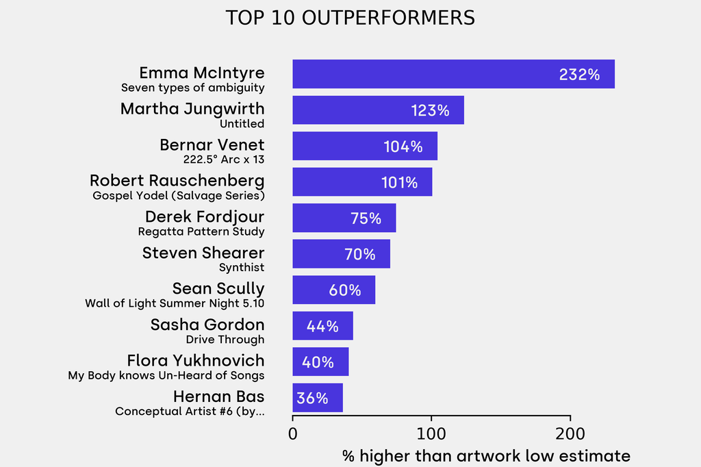 All results include the fees and premiums added to the price of a work of art when the auctioneer's hammer falls. Estimates, sale prices and totals are converted into US dollars. Sale prices are compared to the auction house’s low estimate, which do not include premiums.