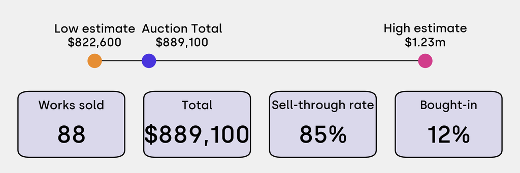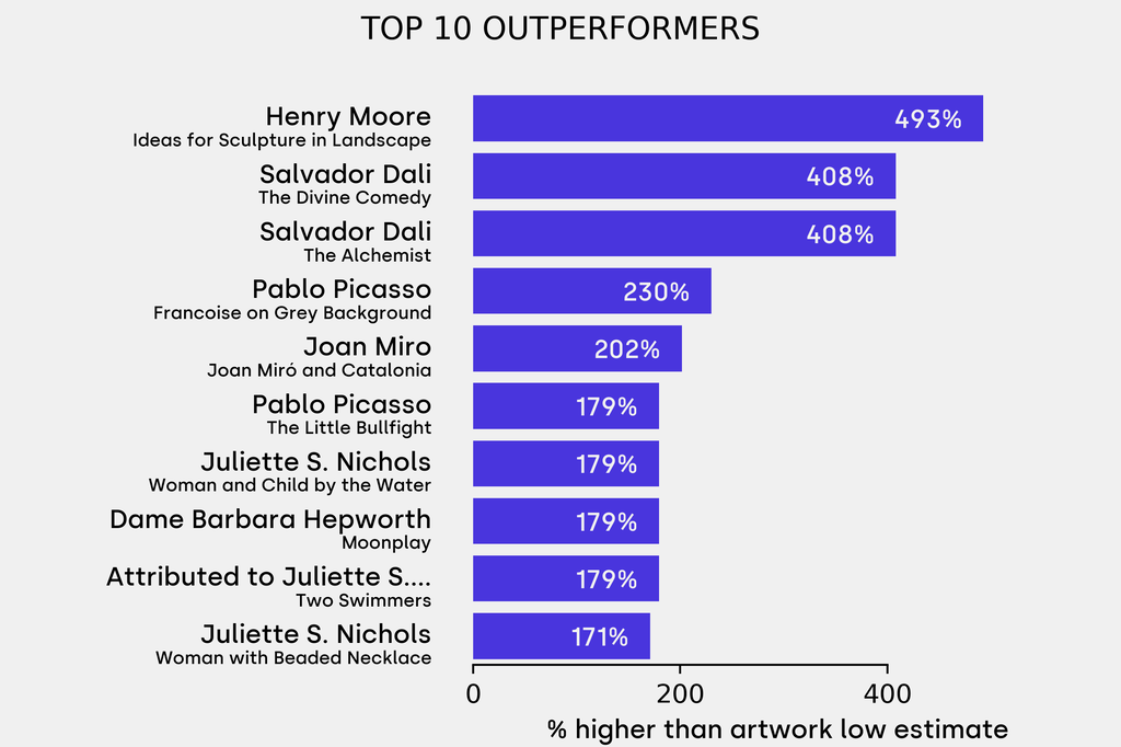 All results include the fees and premiums added to the price of a work of art when the auctioneer's hammer falls. Sale prices are compared to the auction house’s low estimate, which do not include premiums.