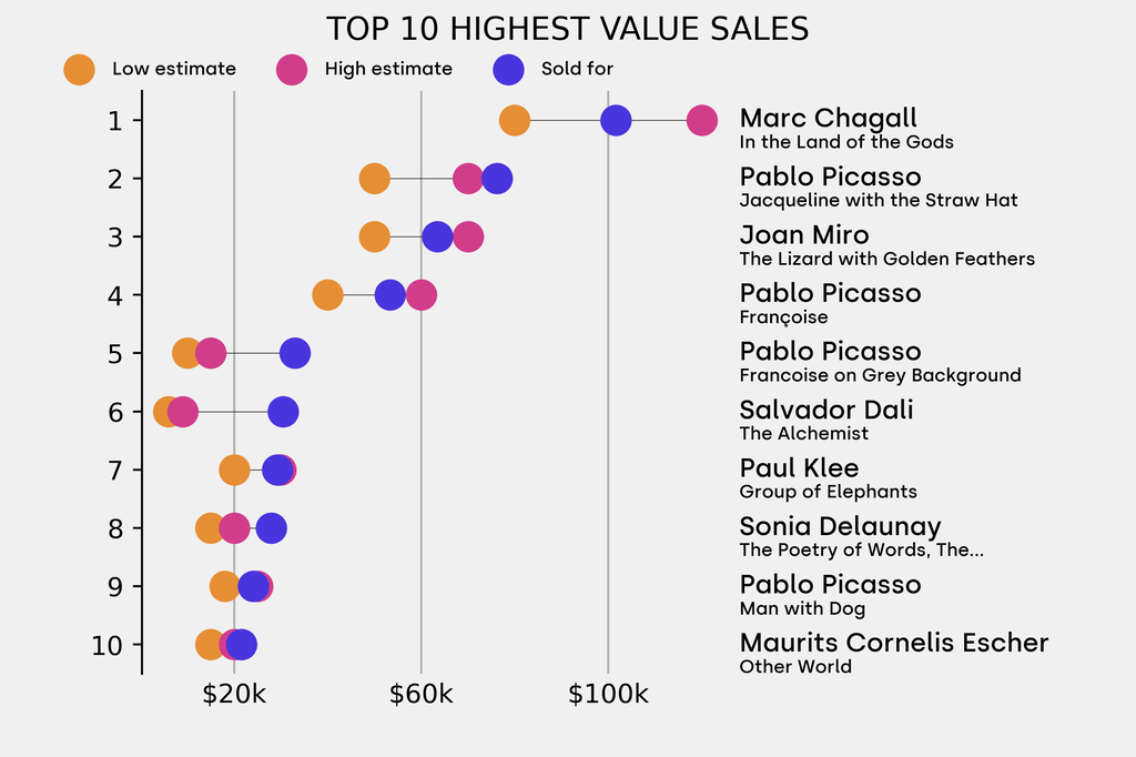 The star lot was: Marc Chagall, In the Land of the Gods (1967), which sold for $101,600, 27% above its $80,000 low estimate.
