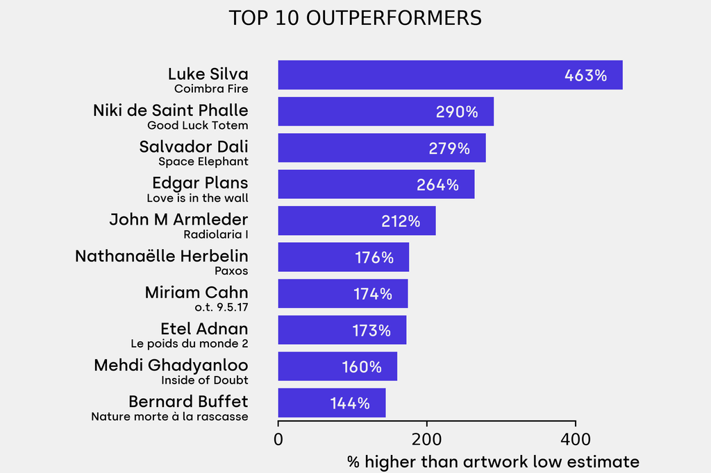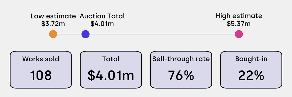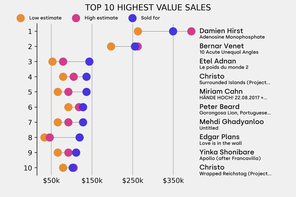 All results include the fees and premiums added to the price of a work of art when the auctioneer's hammer falls. Estimates, sale prices and totals are converted into US dollars. Sale prices are compared to the auction house’s low estimate, which do not include premiums.