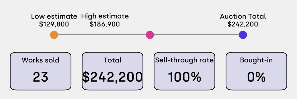 All results include the fees and premiums added to the price of a work of art when the auctioneer's hammer falls. Estimates, sale prices and totals are converted into US dollars. Sale prices are compared to the auction house’s low estimate, which do not include premiums.