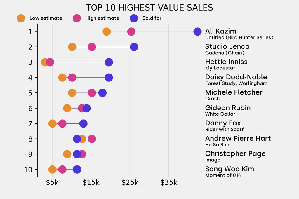The star lot was: Ali Kazim, Untitled (Bird Hunter Series) (2024), which sold for $42,300, 122% above its $19,000 low estimate. It has not been traded before.