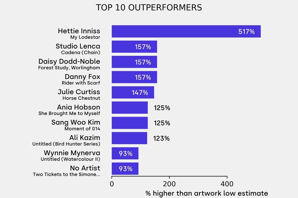 The outperformer sold for 516% above its low estimate. Hettie Inniss, My Lodestar (2025), sold for $19,500 ($3,167 low estimate). It has not been traded before.