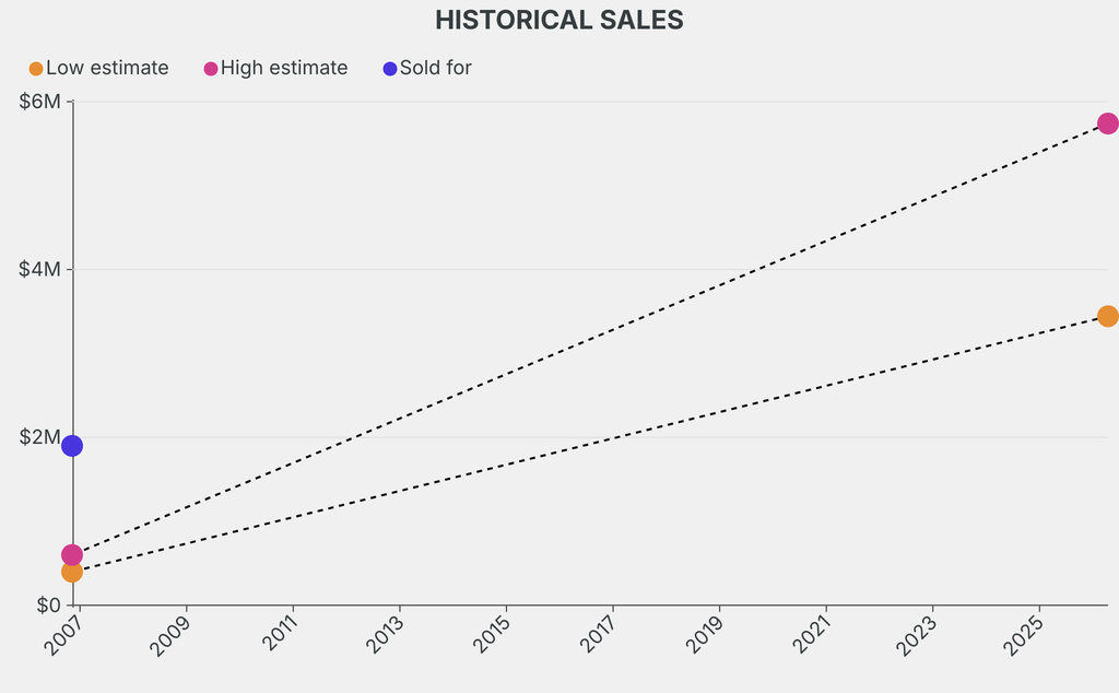 It last sold at auction in 2006 for $1.9m at Christie's. The current low estimate is 760% higher than its previous low estimate of $400,000.