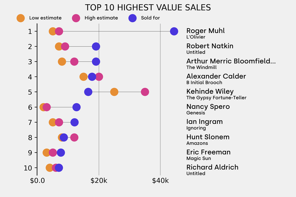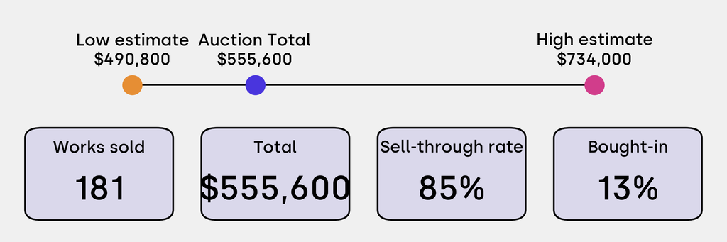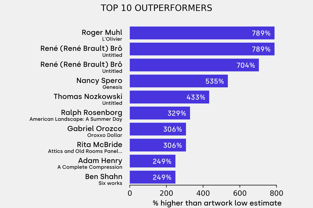 All results include the fees and premiums added to the price of a work of art when the auctioneer's hammer falls. Sale prices are compared to the auction house’s low estimate, which do not include premiums.