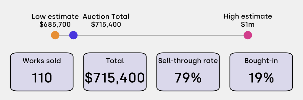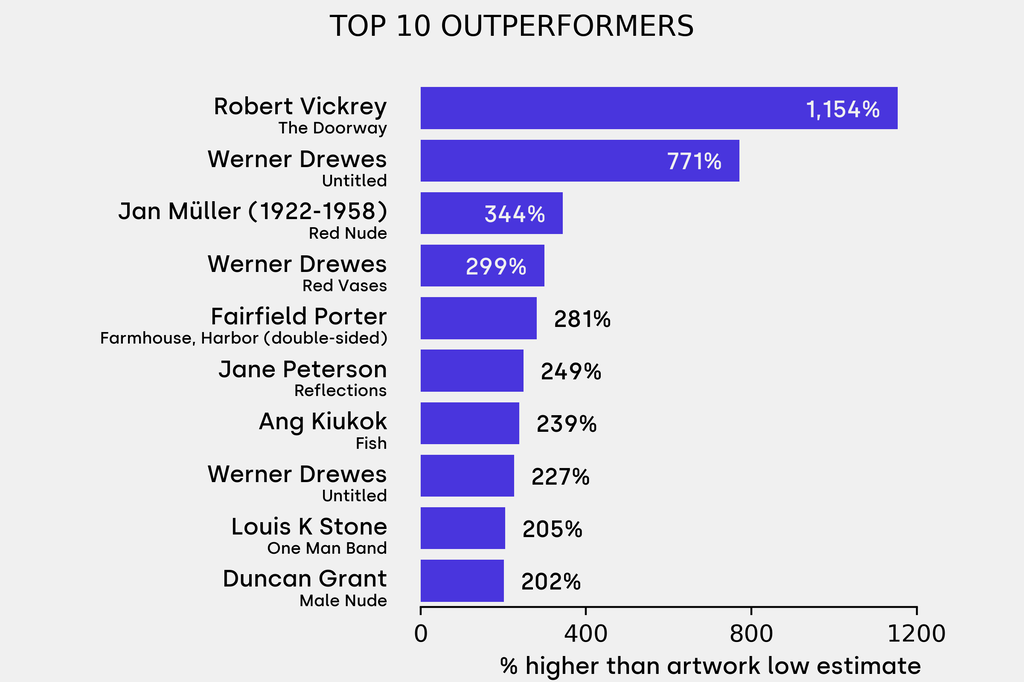 All results include the fees and premiums added to the price of a work of art when the auctioneer's hammer falls. Sale prices are compared to the auction house’s low estimate, which do not include premiums.