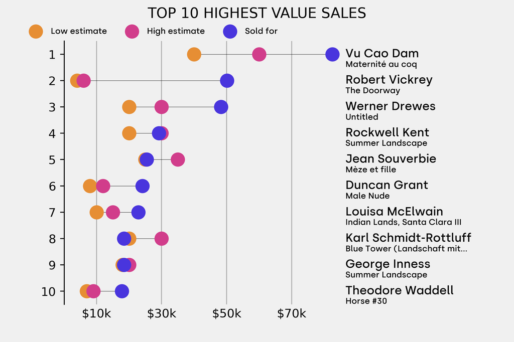 1 work was withdrawn before the sale: Arthur Dove, Untitled (Nude) (1932) estimated at $60,000 (low) to $80,000 (high).