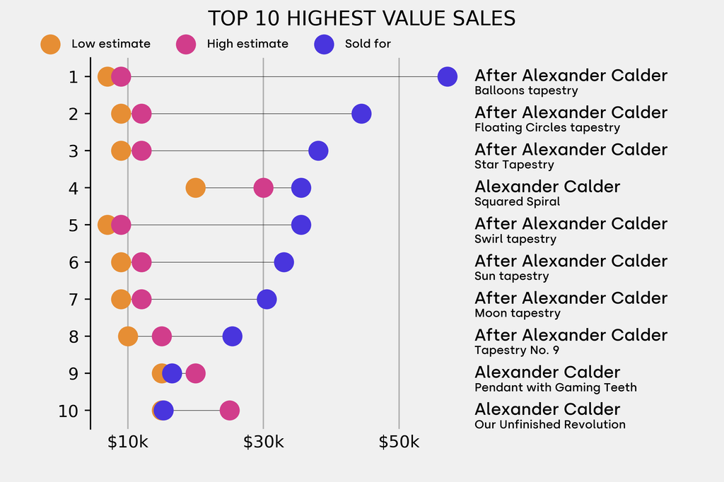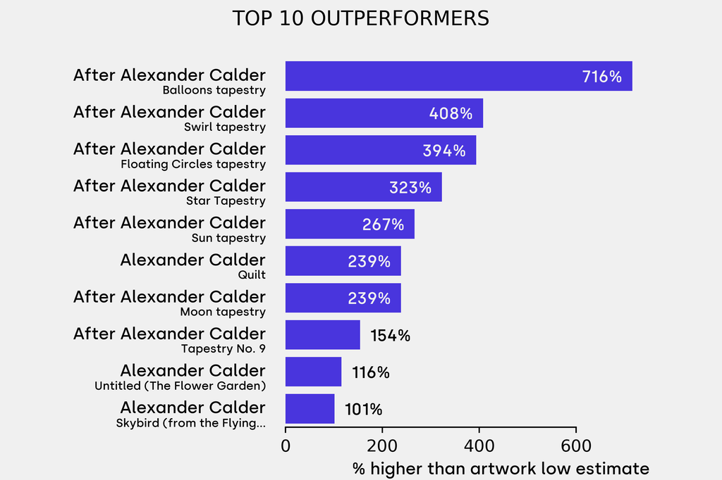 The outperformer sold for 716% above its low estimate. After Alexander Calder, Balloons tapestry (1975), sold for $57,100 ($7,000 low estimate).