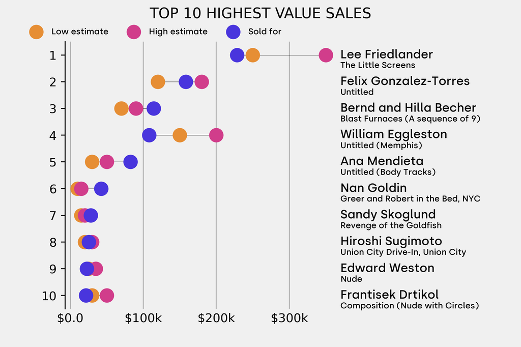 2 works were bought-in, including: Irving Penn, Two Liqueurs (1963), estimated at $100,000 (low) to $150,000 (high). It has not been traded before.