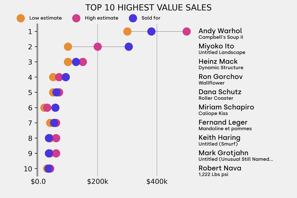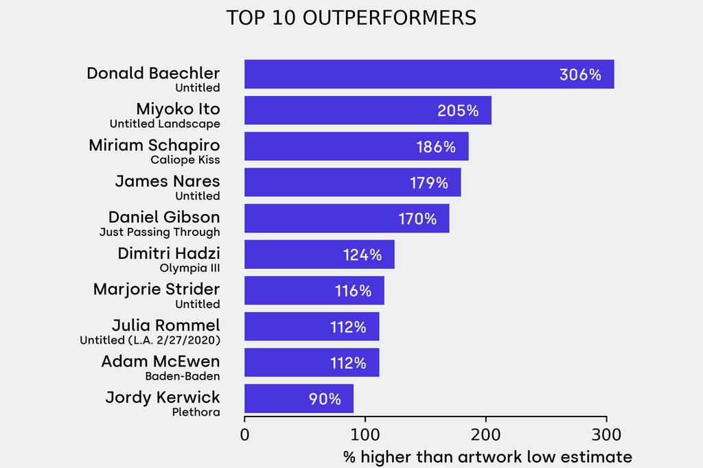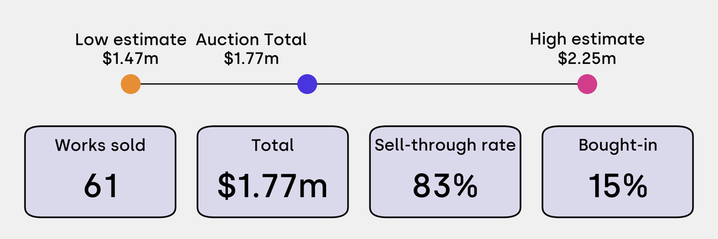 All results include the fees and premiums added to the price of a work of art when the auctioneer's hammer falls. Sale prices are compared to the auction house’s low estimate, which do not include premiums.