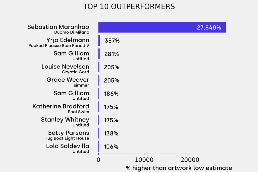 The outperformer sold for 27839% above its low estimate. Sebastian Maranhao, Duomo Di Milano (2025), sold for $27,900 ($100 low estimate). It has not been traded before.