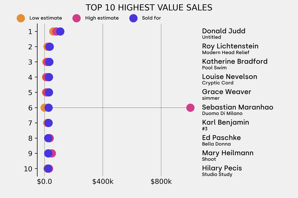 The star lot was: Donald Judd, Untitled (1991), which sold for $107,900, 79% above its $60,000 low estimate. It has not been traded before.