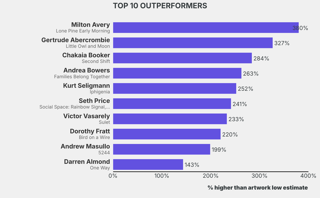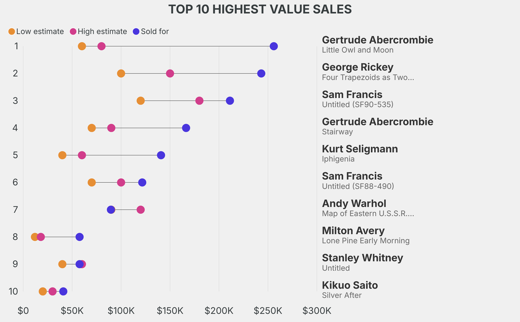 The star lot was: Gertrude Abercrombie, Little Owl and Moon (1956), which sold for $256,000, 326% above its $60,000 low estimate. It has not been traded before.