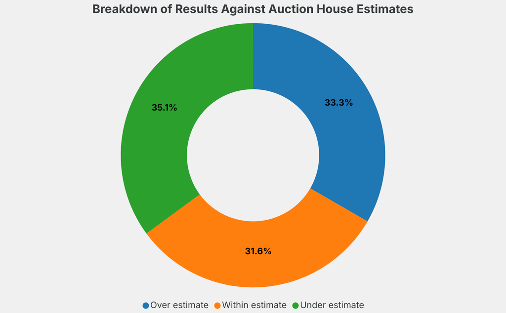 All results include the fees and premiums added to the price of a work of art when the auctioneer's hammer falls. Sale prices are compared to the auction house’s low estimate, which do not include premiums.