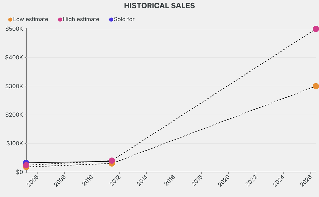 It last sold at auction in 2011 for $37,500 at Sotheby's. The current low estimate is 900% higher than its previous low estimate of $30,000.