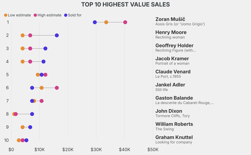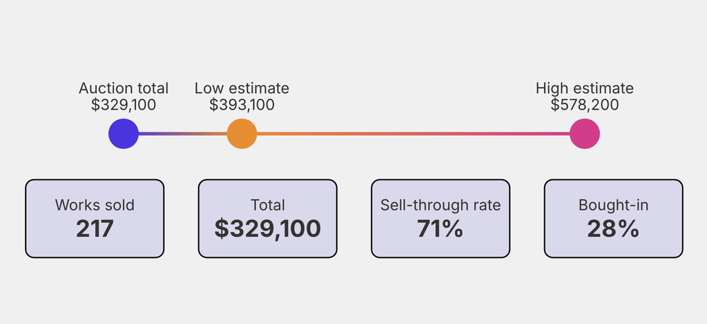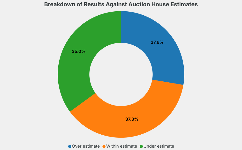 All results include the fees and premiums added to the price of a work of art when the auctioneer's hammer falls. Estimates, sale prices and totals are converted into US dollars. Sale prices are compared to the auction house’s low estimate, which do not include premiums.
