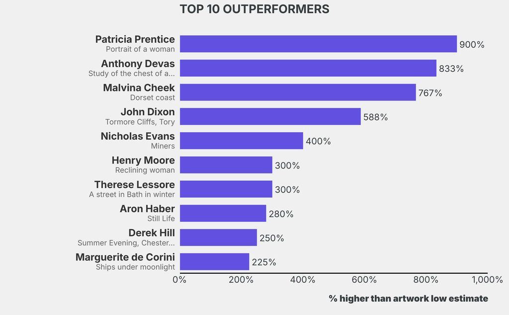 The outperformer sold for 900% above its low estimate. Patricia Prentice, Portrait of a woman (Undated), sold for $4,022 ($402 low estimate). It has not been traded before.