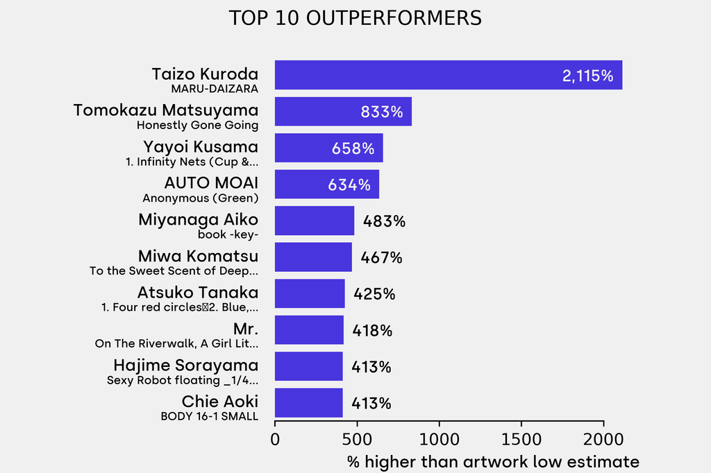 The outperformer sold for 2114% above its low estimate. Taizo Kuroda, MARU-DAIZARA (2007), sold for $28,000 ($1,265 low estimate).