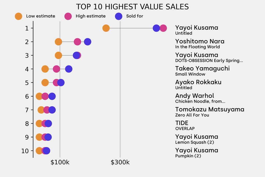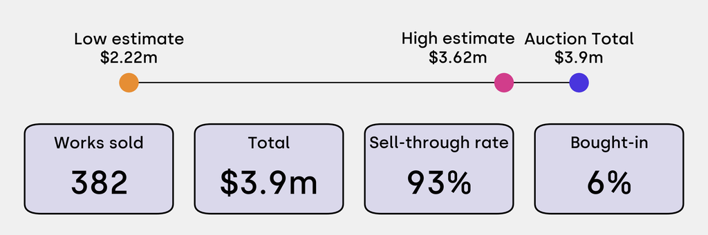 All results include the fees and premiums added to the price of a work of art when the auctioneer's hammer falls. Estimates, sale prices and totals are converted into US dollars. Sale prices are compared to the auction house’s low estimate, which do not include premiums.
