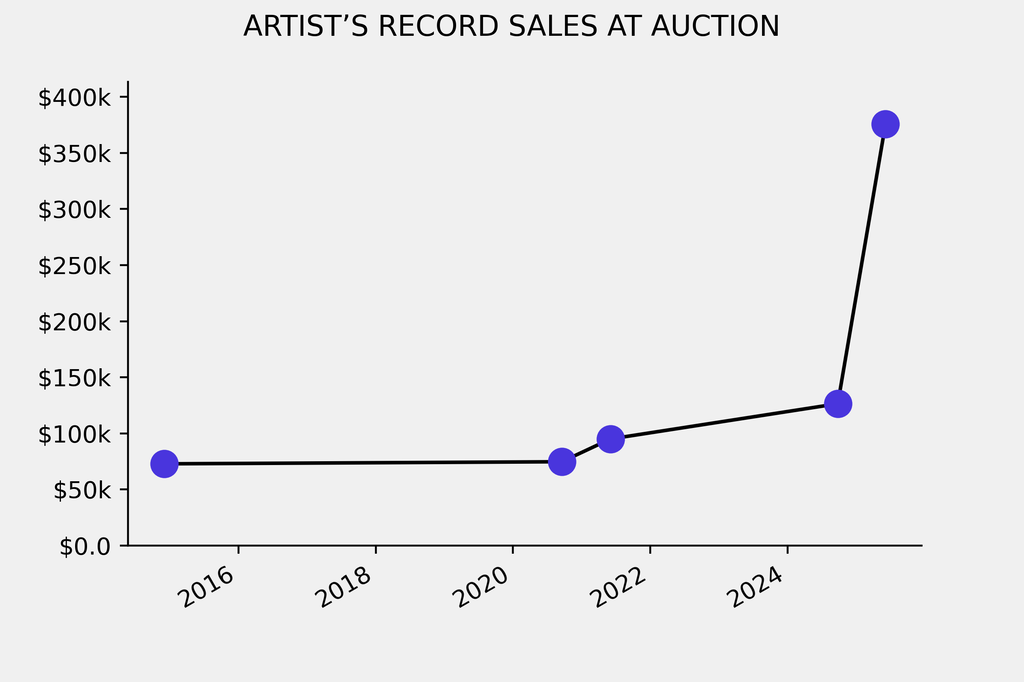 The sale beat Jaffe's previous auction record by $249,400, a 175% rise. Her previous record was set by The Golden Edge (1982), which sold for $126,400 at Christie's on September 24, 2024. The work had been traded once in the past.