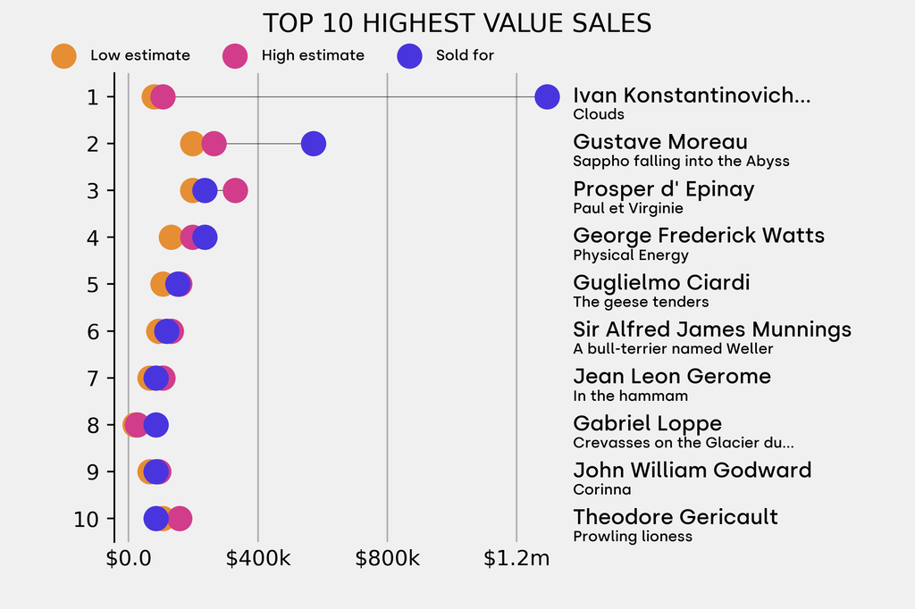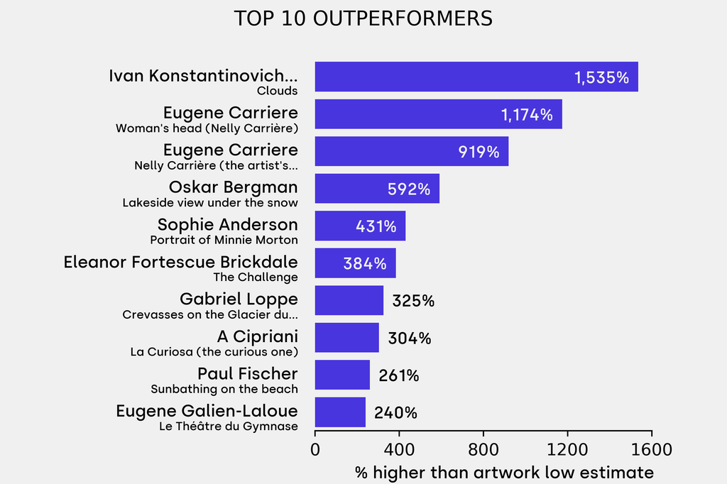 The outperformer sold for 1535% above its low estimate. Ivan Konstantinovich Aivazovsky, Clouds (1865), sold for $1.29m ($79,100 low estimate). It has been traded once in the past.