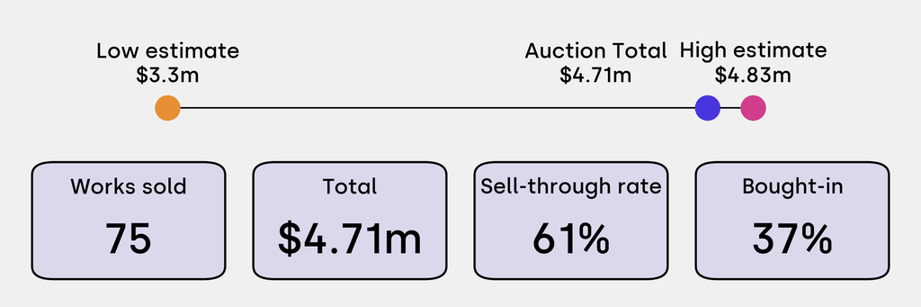 All results include the fees and premiums added to the price of a work of art when the auctioneer's hammer falls. Estimates, sale prices and totals are converted into US dollars. Sale prices are compared to the auction house’s low estimate, which do not include premiums.