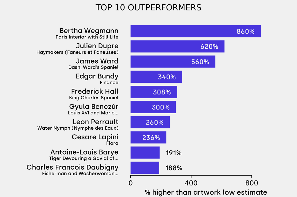 The outperformer sold for 860% above its low estimate. Bertha Wegmann, Paris Interior with Still Life (1880), sold for $96,000 ($10,000 low estimate). It has been traded once in the past.