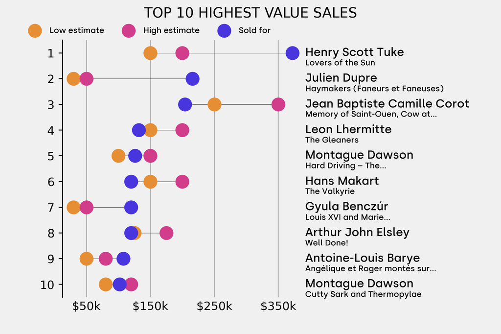The star lot was: Henry Scott Tuke, Lovers of the Sun (1923), which sold for $372,000, 148% above its $150,000 low estimate. It has been traded 6 times in the past.
