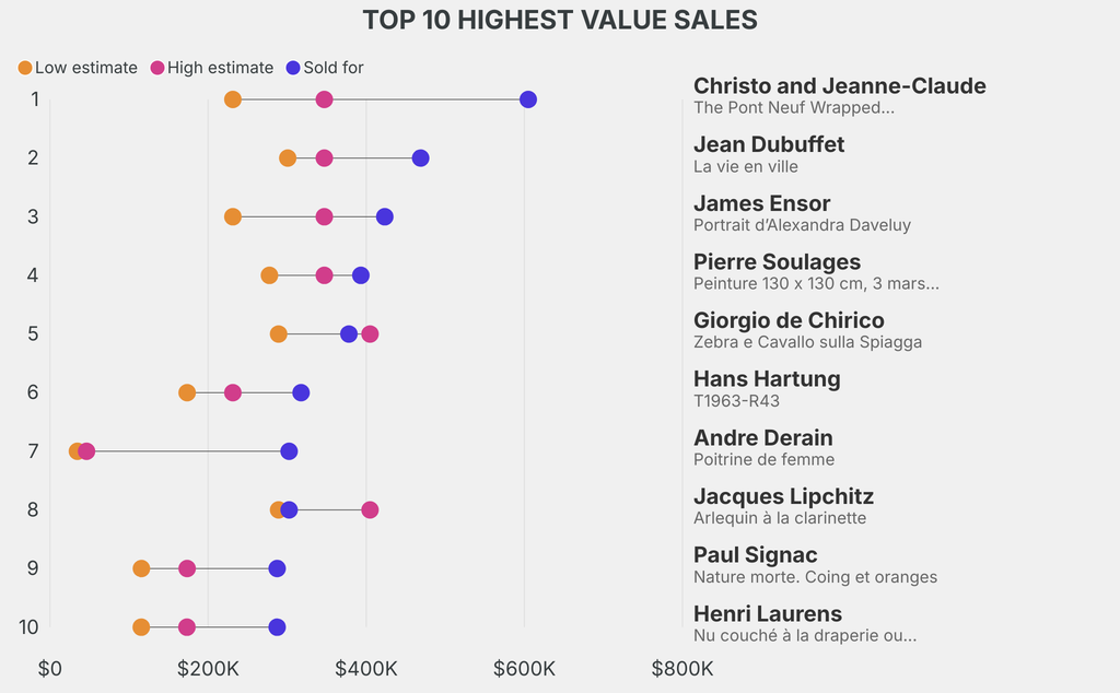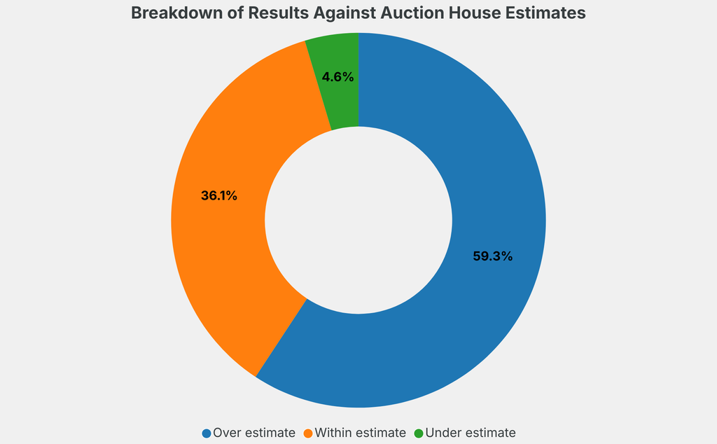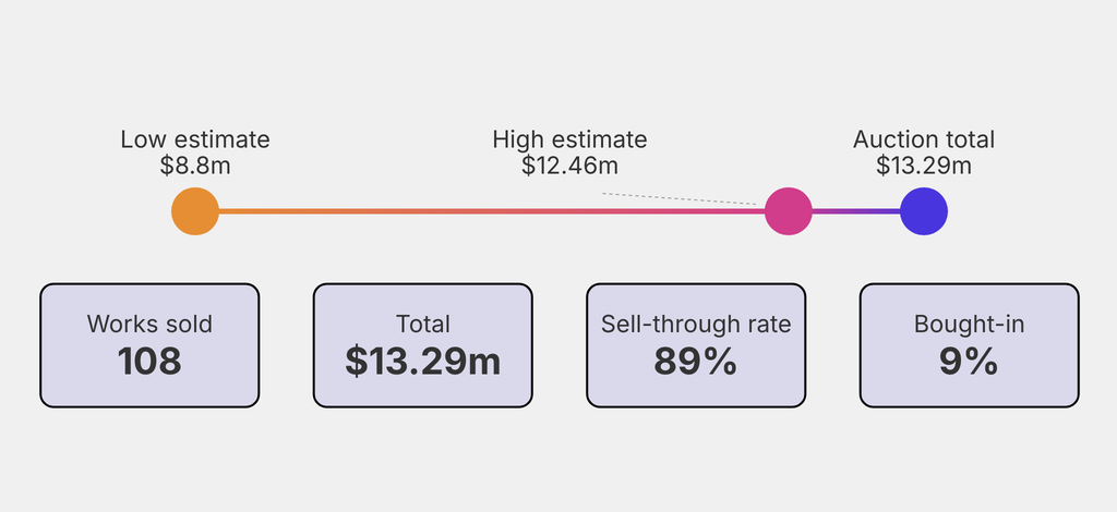 All results include the fees and premiums added to the price of a work of art when the auctioneer's hammer falls. Estimates, sale prices and totals are converted into US dollars. Sale prices are compared to the auction house’s low estimate, which do not include premiums.