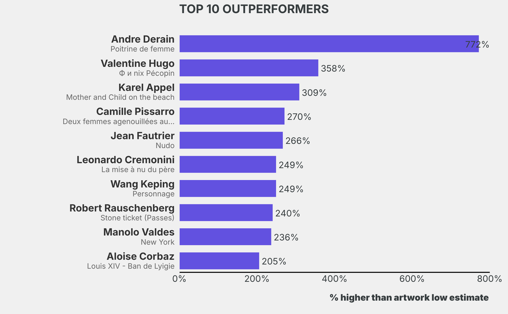 The outperformer sold for 771% above its low estimate. Andre Derain, Poitrine de femme (1933), sold for $302,500 ($34,700 low estimate). It has been traded 4 times in the past.