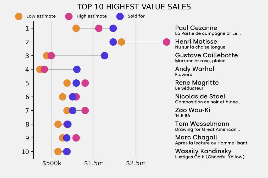 All results include the fees and premiums added to the price of a work of art when the auctioneer's hammer falls. Estimates, sale prices and totals are converted into US dollars. Sale prices are compared to the auction house’s low estimate, which do not include premiums.