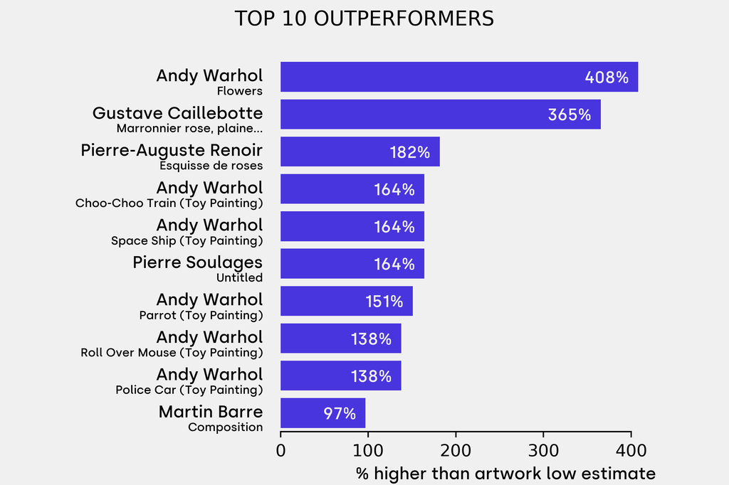 The outperformer sold for 408% above its low estimate. Andy Warhol, Flowers (1964), sold for $1.09m ($215,300 low estimate). It has been traded 4 times in the past.