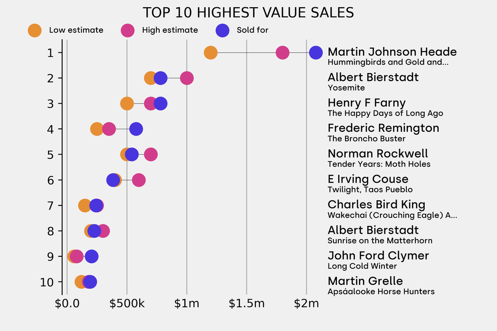 The star lot was: Martin Johnson Heade, Hummingbirds and Gold and Purple Orchids (1875), which sold for $2.08m, 73% above its $1.2m low estimate. It has been traded 4 times in the past.
